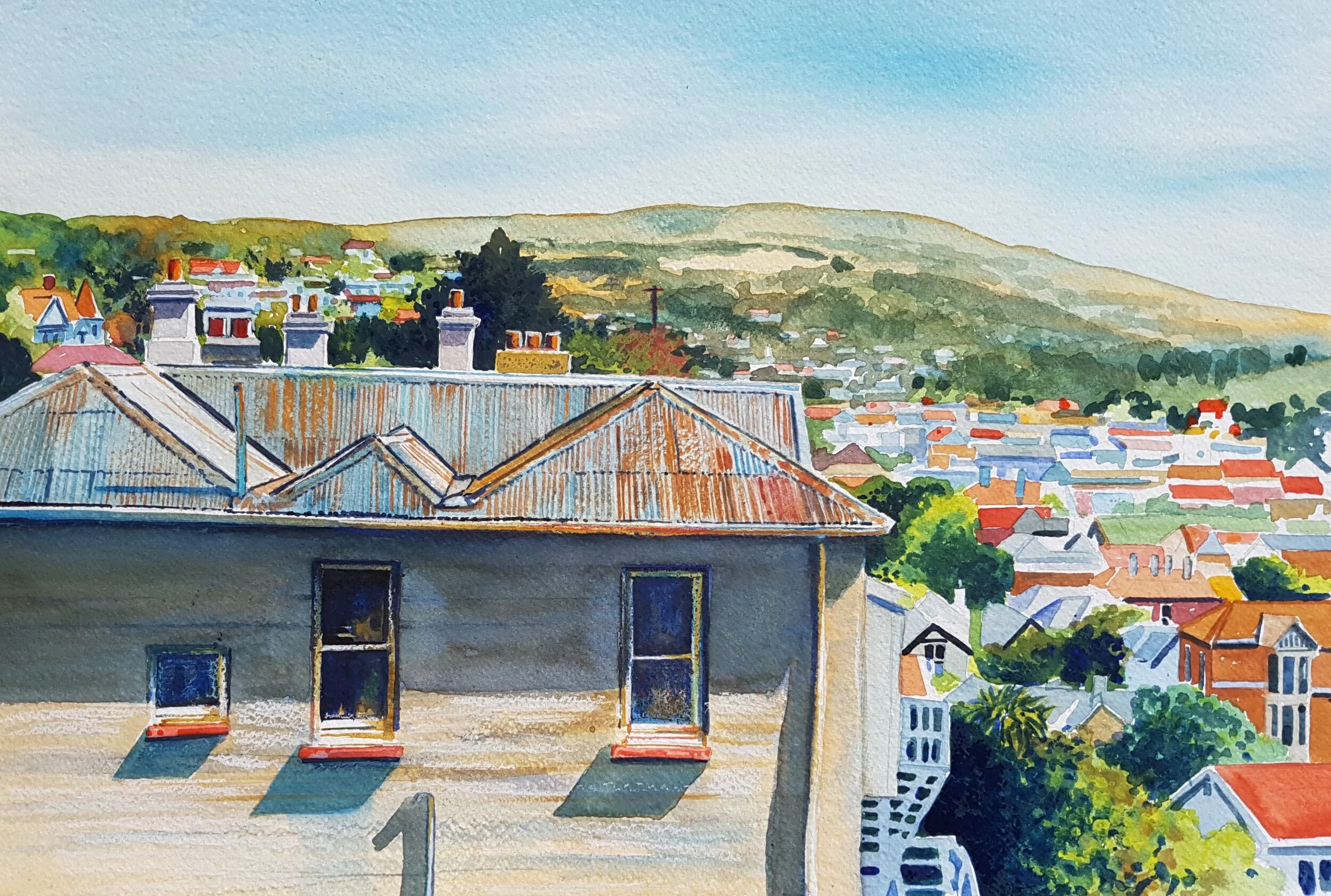 A view from Angus’ flat, North Dunedin. Watercolour 560x380mm. [sold]